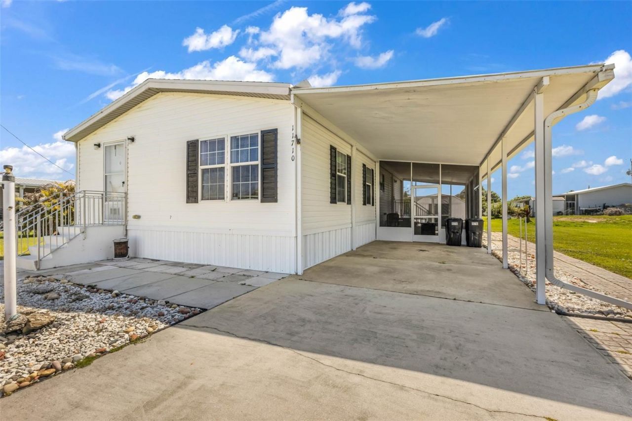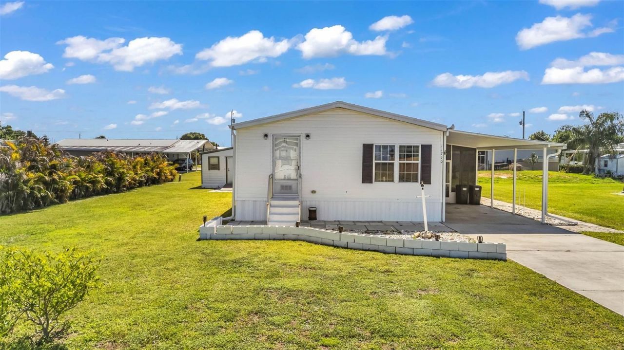 NEW ROOF (2021) & NEW A/C (2023) on this well-maintained 2 bedroom, 2 bathroom manufactured home located near Sunnybreeze Golf Course. This property offers a functional layout with cathedral ceilings that create an open feel and laminate flooring throughout the main living areas for easy maintenance.The kitchen features solid wood cabinetry, standard appliances, and ample storage. An indoor laundry area includes washer, dryer, and additional cabinet space for convenience.Exterior features include a covered carport and screened lanai, providing additional usable space for relaxation or entertaining. The property also includes two large sheds for storage, hobbies, or equipment, along with concrete pad areas in the rear offering added flexibility.Serviced by a well with water treatment system. Conveniently located with access to nearby recreation, golf, and surrounding areas.