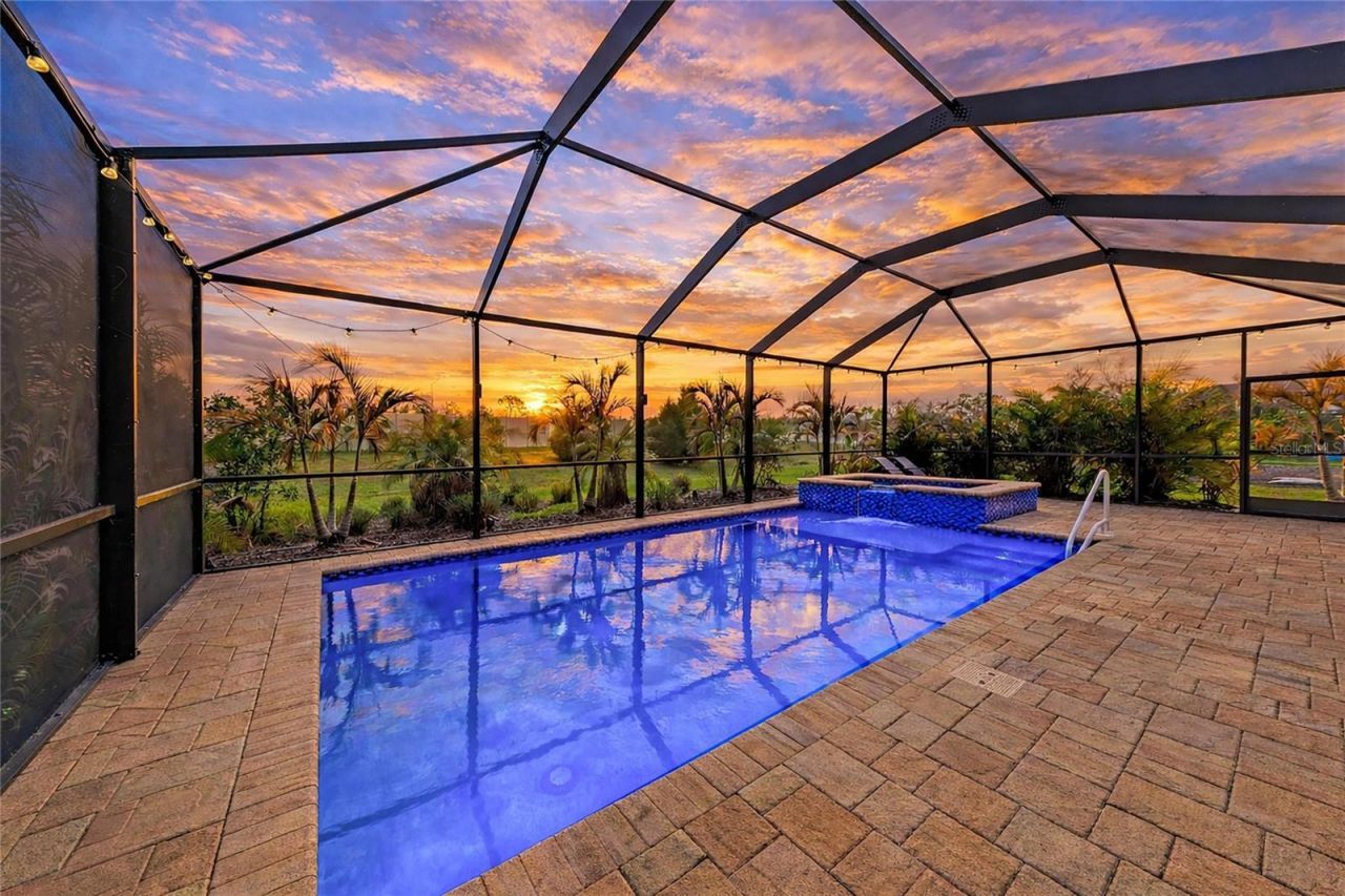 Motivated Seller Alert!! This POOL/SPA home features outdoor PRIVACY GALORE with 3 bedrooms, 3 bathrooms, and a 2-car garage. Every window has ACCORDION HURRICANE SHUTTERS, and there is an electric KEVLAR HURRICANE SCREEN. LAWN MOWING IS INCLUDED in the LOW HOA fees. There is NO CDD fee, and the home is in a convenient, desirable part of town. There are 3 FULL BATHROOMS dedicated to each bedroom in this SPLIT FLOOR PLAN. The OPEN CONCEPT living area boasts an ELECTRIC FIREPLACE, a FEATURE WALL, and porcelain tile floors. The kitchen has modern finishes, GRANITE COUNTER TOPS, stainless steel appliances, a new stove and dishwasher, and a WALK-IN PANTRY. The master bath is complete with a SOAKING TUB, a separate shower, and DUAL SINKS. The home is equipped with a PE SOLAR PANEL system with Enphase IQ7 microinverters, contributing to REDUCED MONTHLY ELECTRIC COSTS. There is a WHOLE-HOUSE water system by Express Water, including a REVERSE OSMOSIS softener, that delivers clear, mineral-balanced water. The MATURE LANDSCAPING surrounds the upgraded paver sidewalk. A screened-in entryway enclosure provides a nice cross breeze throughout the home. Conveniently located within 15 minutes of 11 county beaches. Minutes from Downtown Venice, shopping, dining, golf, and the Wellen Park Town Center, and the Atlanta Braves Spring Training facility, this home is perfect for full-time living or a seasonal retreat.
